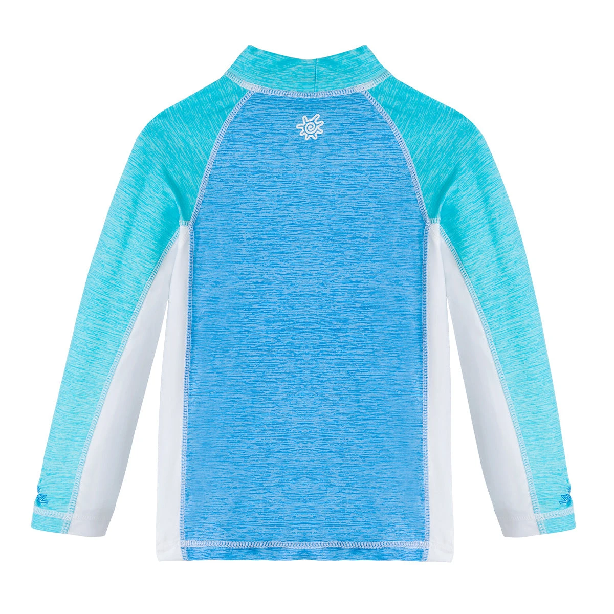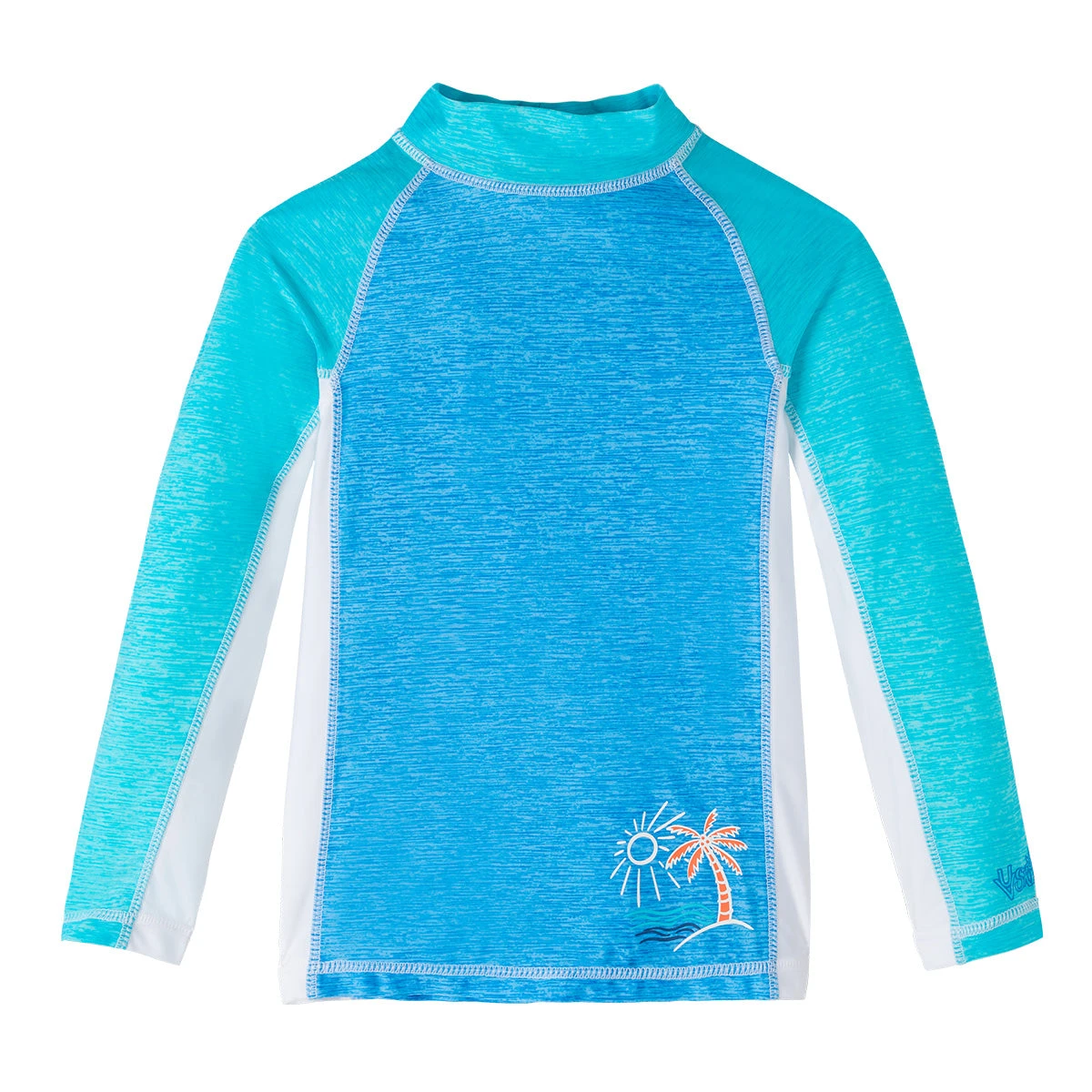 With sporty side panels and raglan cut sleeves for increased mobility, this boy’s long sleeve UPF 50+ swim shirt sure to keep your little man covered, comfortable, and stylish on any and all adventures out under the sun.