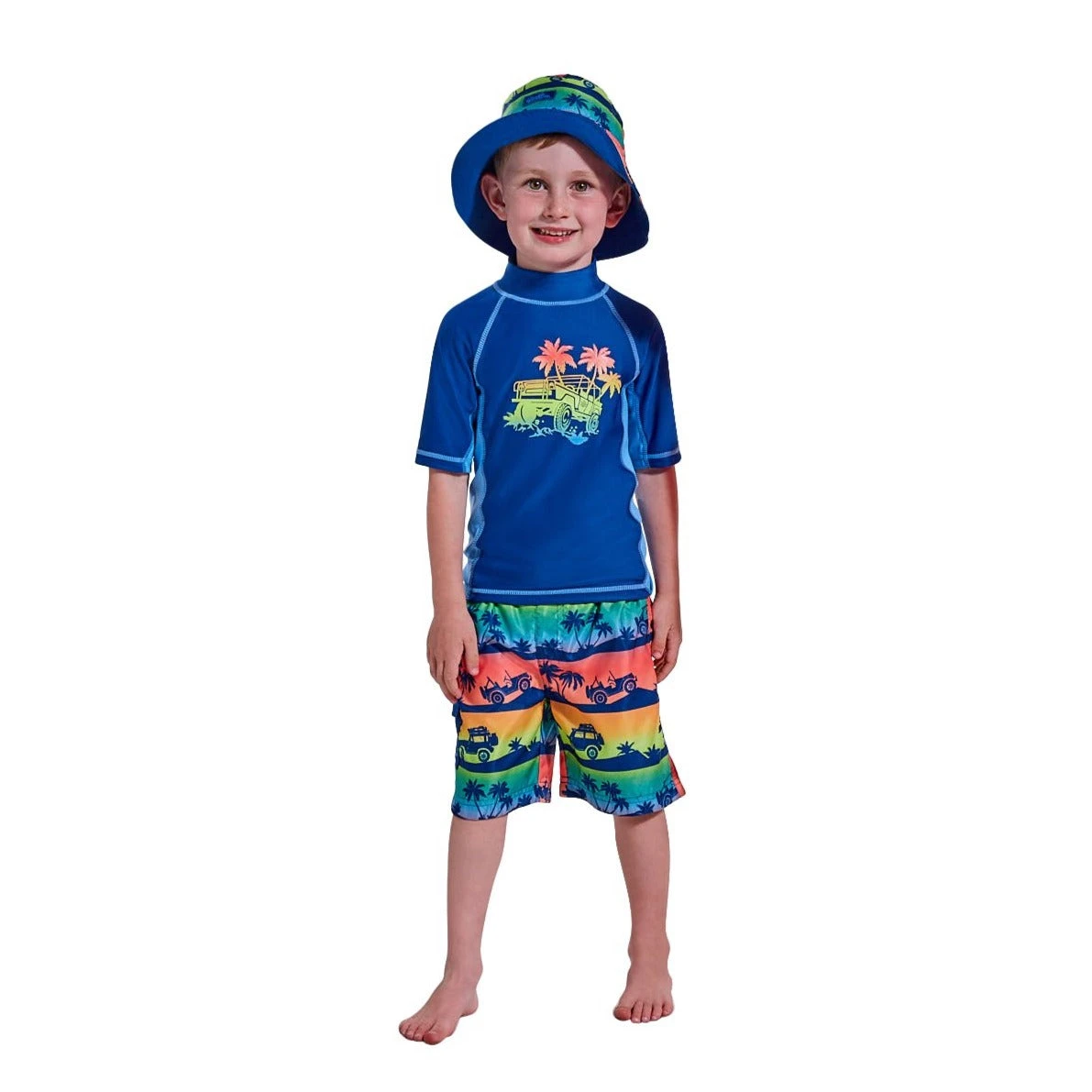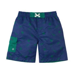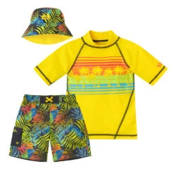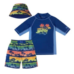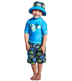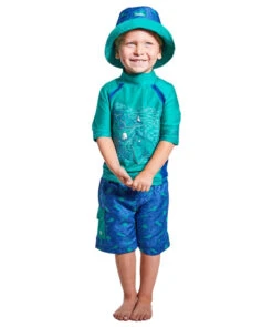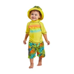Our boys’ three piece swim set is the perfect outfit to keep your little one safe while having fun out under the sun. This set features a short sleeve swim shirt, matching boys’ board shorts, and a reversible boys’ sun hat for excellent sun protection and coverage. Certified UPF 50+, this swim set will keep him safe from the sun’s UV rays no matter where his outdoor adventures take him.Â