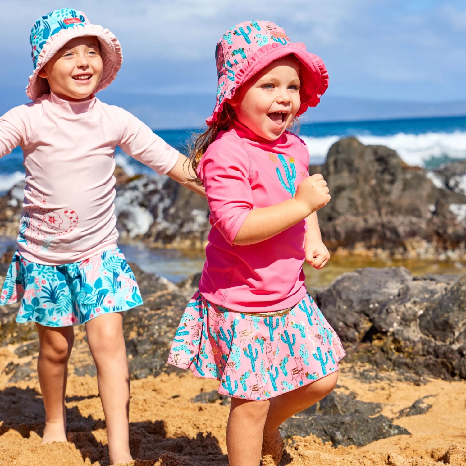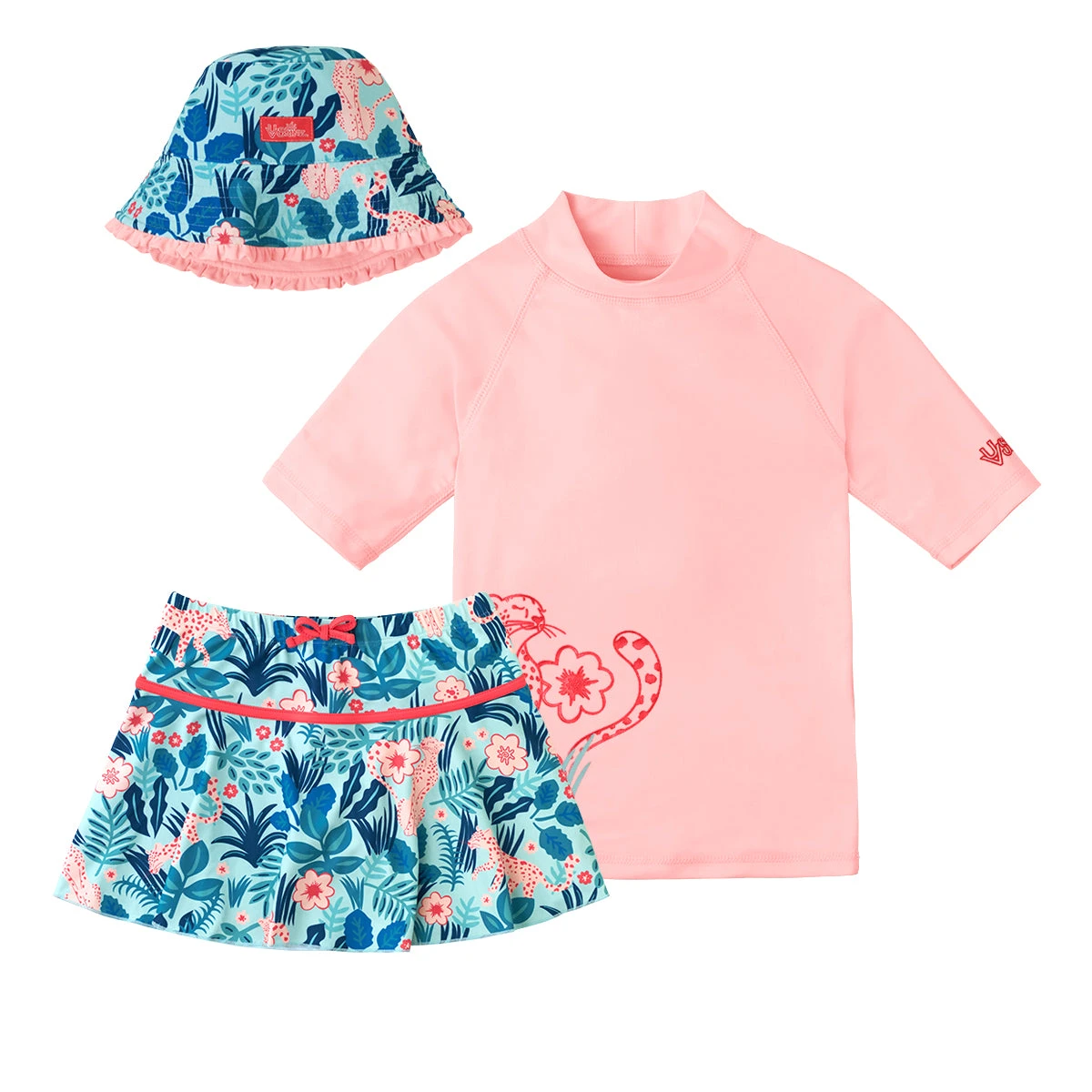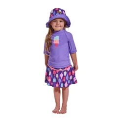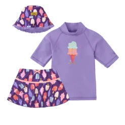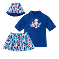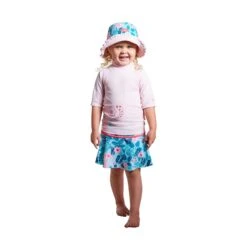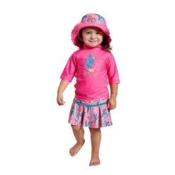 Our girls swimsuit set is the perfect outfit to keep your little one safe while having fun out under the sun. This swimwear set for girls features a short sleeve swim shirt, a matching swim skirt, and a reversible sun hat. Rated UPF 50+ this swimwear set will keep her sun safe all day long.