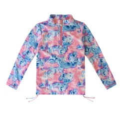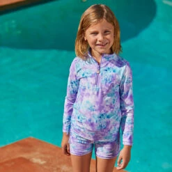 This girl’s half zipped ruched swim shirt is absolutely adorable and offers protection from 98% of the sun’s UV rays. Pair this girls swim shirt with our matching UV swim shorts and you have a fashionable sun-protective swimsuit she’ll love to play in year-round.