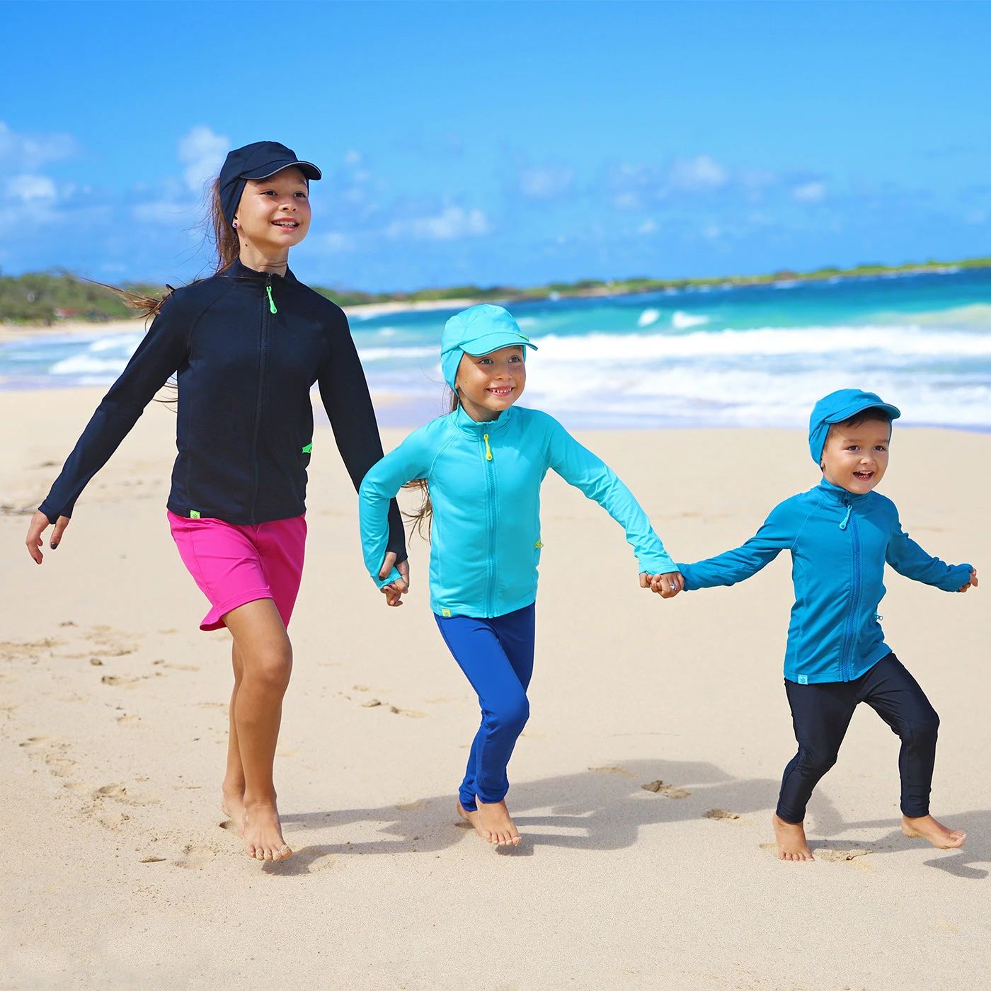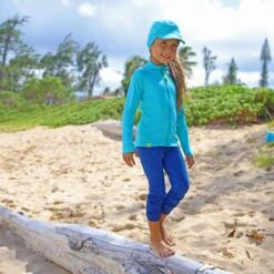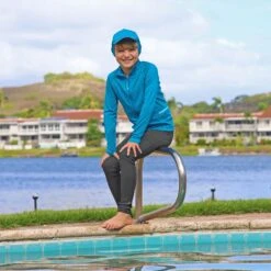 For when the weather is overcast or cold, try on UV Skinz’s kid’s long-sleeve fleece with sun protection. Certified UPF 50+ and recommended by the Skin Cancer Foundation, this kid’s jacket will keep you safe from the sun’s rays while also keeping you warm during cooler weather activities, like snowboarding, skiing, or swimming in colder water.