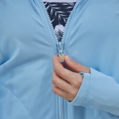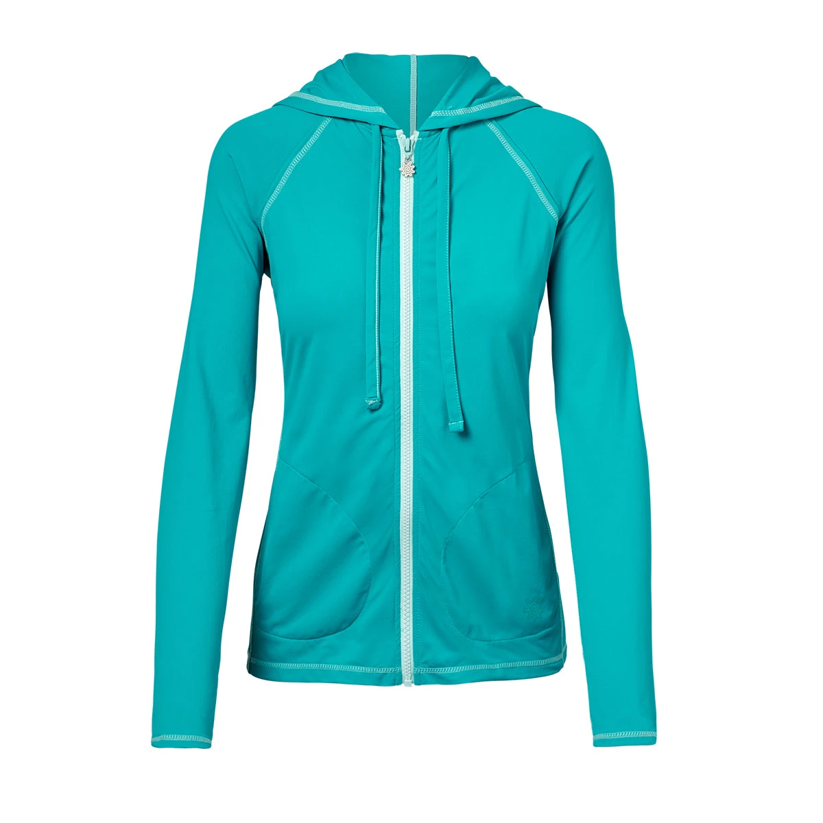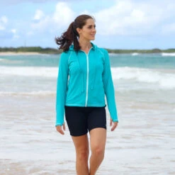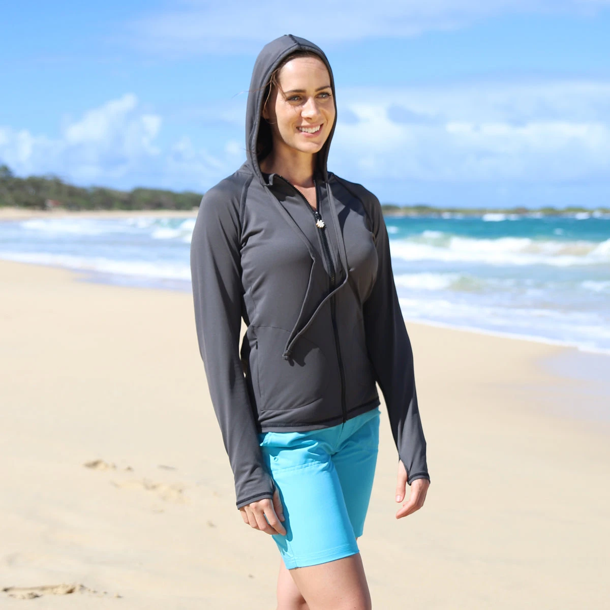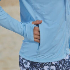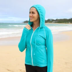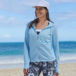Perfect as a cover-up after a swim, or an extra layer when things cool off, our women’s hooded water jacket is a versatile and stylish sun protective jacket she’ll love to wear. Certified UPF 50+, pair this jacket for women with a swim tank top and shorts for a cute beach look.